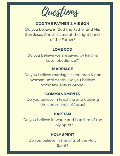 When searching for a church to attend, here are some questions you can ask the church to find out their beliefs. The church that obeys the Lord Jesus Christ should be in agreement and say