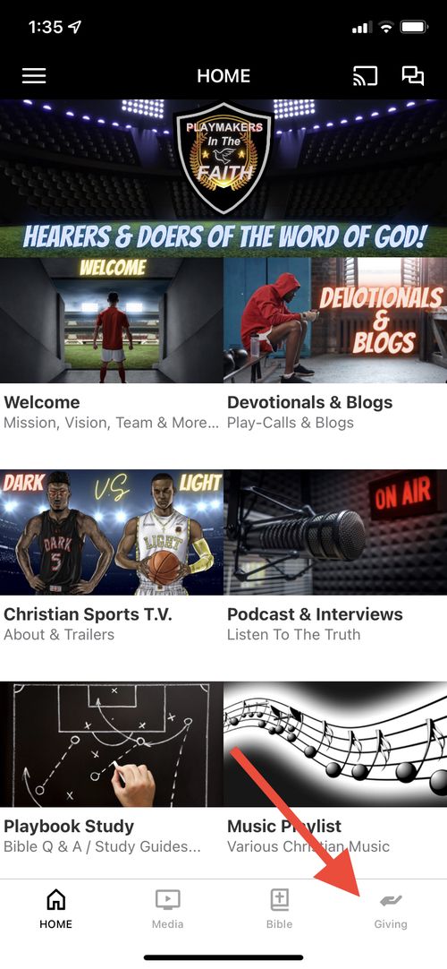 *If you are signing up through our mobile app please sign up for monthly giving by pressing the giving button at the bottom right corner of the app on the home page. See picture below.